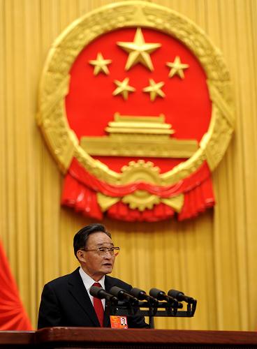 3月8日,十二屆全國人大一次會議在北京人民大會堂舉行第二次全體會議。吳邦國作人大常委會工作報告。新華社記者 謝環馳 攝