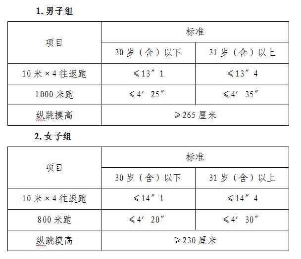 報考公安機關(含森林公安)、監(jiān)獄、勞動教養(yǎng)管理機關的人民警察和人民法院、人民檢察院司法警察職位的考生須進行體能測評,體能測評不合格者不能參加面試。體能測評按照人力資源和社會保障部、公安部、國家公務員局聯(lián)合頒布的《關于印發(fā)公安機關錄用人民警察體能測評項目和標準(暫行)的通知》(人社部發(fā)〔2011〕48號)執(zhí)行。