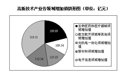 2011年前十一個月,某省高新技術產業完成總產值3763.00億元,實現增加值896.31億元。增加值同比增長30.74%,比規模以上工業增加值高11.64個百分點,占規模以上工業增加值的比重達到25.32%。高新技術產業各領域的增加值如下圖所示: