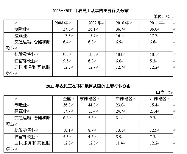 2011年全國農民工總量達到25278萬人,比上年增加1055萬人,增長4.4%。農民工從業仍以制造業、建筑業和服務業為主,從事建 筑業的比重明顯提高。從農民工的就業地區來看,2011年在東部地區務工的農民工16537萬人,比上年增加324萬人;在中部地區務工的農民工4438 萬人,比上年增加334萬人,增長8.1%;在西部地區務工的農民工4215萬人,比上年增加370萬人,增長9.6%。
