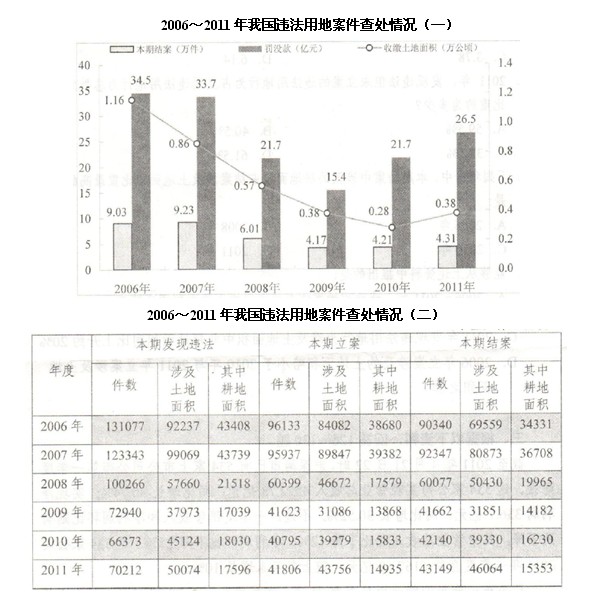 2011年發現違法用地行為7.0萬件,涉及土地5.0萬公頃(耕地1.8萬公頃),同比分別上升5.8%、11.0%(耕地下降 2.4%)。立案查處違法用地案件4.2萬件,涉及土地4.4萬公頃(耕地1.5萬公頃),同比分別上升2.5%、11.4%(耕地下降5.7%)。依法 拆除違法構建筑物1289.8萬平方米,收回土地3791.2公頃(耕地1064.7公頃),罰沒款26.5億元。