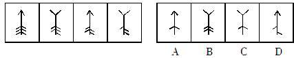 解題思路:此題為細節(jié)變化問題,故思維圈定為前后圖對比尋找細節(jié)差異。第一圖與第二圖比較可發(fā)現(xiàn),箭頭方向發(fā)生變化、左邊的小線段從最下面減少一條,對 比第二圖與第三圖,箭頭方向又發(fā)生變化、右邊的小線段從最上面減少一條,即可推得可能性規(guī)律,以第三、四幅圖進行驗證,符合,對照選項,可得題解為D。