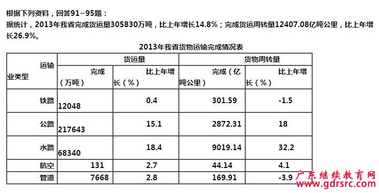 91( 單選題 )2013年,我省各類運輸業務貨運量完成最多的是( )。