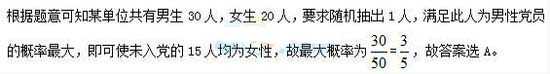 61、某單位有50人,男女性別比為3:2,其中有15人未入黨,如從中任選1人,則此人為男性黨員的概率最大為多少?