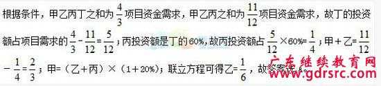 70、甲、乙、丙、丁四人共同投資一個項目,已知甲的投資額比乙、丙二人的投資額之和高20%,丙的投資額是丁的60%,總投資額比項目的資金需求高1/3。后來丁因故臨時撤資,剩下三人的投資額之和比項目的資金需求低1/12。則乙的投資額是項目資金需求的: