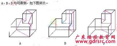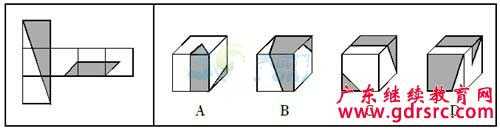 【答案解析】B項中右側面上的陰影三角形與頂面的陰影不相接;C項中正面的三角形應位于該面右下角;D項右側面陰影三角形方位錯誤。A可由題干圖形折疊而成。