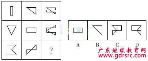 【答案解析】從每行來看,第一個圖形順時針旋轉90度后與第二個圖形疊加,去同存異得到第三個圖形。按照這種變化規律應選擇D。