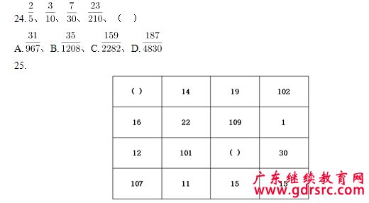一、數字推理。每道題給出一個數列,但其中缺少一項,要求報考者仔細觀察這個數列各數字之間的關系,找出其中的排列規(guī)律,然后從四個備選項中選出最合適、最合理的一個來填補空缺項,使之符合原數列的排列規(guī)律。