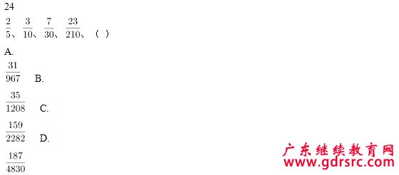 【解析】分母變化幅度很大,倍數(shù)關(guān)系為2、3、7,與三項(xiàng)分母相同。再觀察分子,5-2=3、10-3=7、30-7=23、210-23=187。故題干所求分?jǐn)?shù)的分子應(yīng)為210-23=187,分母為23×210=4830。