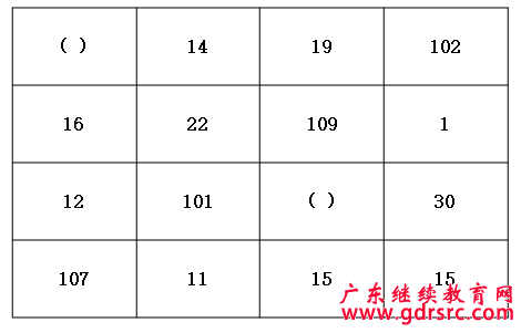 【解析】表格題目。按照列,或者按照行觀察表格,數(shù)值較大的數(shù)字位置不固定,和差倍比也不能成關(guān)系。然后考慮每一行、每一列相加的和,結(jié)果都為148。所以左上角括號的數(shù)字應(yīng)該為148-14-19-102=13。