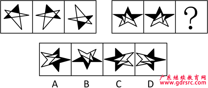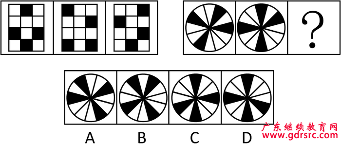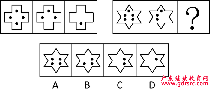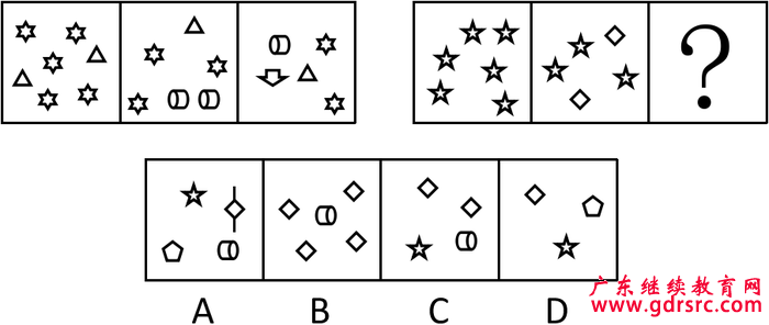 【解析】本題為雙重考點(diǎn),首先考查是元素的種類,第一幅圖由兩種元素組成、第二幅圖由三種元素組成、第三幅圖由四種元素組成。第二組圖中已知兩幅圖分別由1、2種元素組成,故問號(hào)處填入3種元素組成,排除A、B選項(xiàng)。