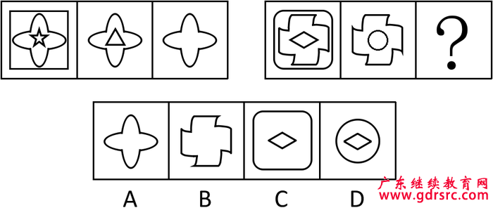 方法二:本題每組圖形都含有一個(gè)共同的元素圖形,故選B。