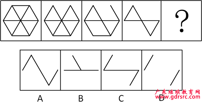 【解析】觀察給出的圖形,第一張圖減去了一條線得到了第二張圖,第二張圖減少了兩條線得到了第三組圖,第三組圖片減去了三條線得到了第四幅圖,以此類推,問號(hào)處填入的應(yīng)該是第四幅圖減去四條線得到的圖形,即只剩下兩條線,D選項(xiàng)符合題意。