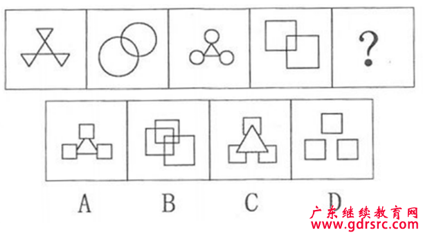 【解析】觀察本題不難發(fā)現(xiàn)第一張圖和第三張圖都是以一個(gè)三角形為中心,其三個(gè)頂點(diǎn)與其他圖形相交,第二張和第四張是兩個(gè)同樣的圖形相交,故可以推出問號(hào)部分填入的應(yīng)該是以三角形的三個(gè)頂點(diǎn)和其他圖形點(diǎn)交,答案選擇A選項(xiàng)。