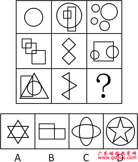 【解析】本題為傳統(tǒng)九宮格圖形,首先橫向觀察,不難發(fā)現(xiàn),第一行都有元素“圓”,第二行圖都有元素“正方形”,第三行前兩個(gè)圖形都有元素“三角形”,故填入圖形應(yīng)該有三角形,A選項(xiàng)符合題意。