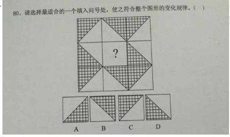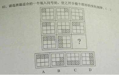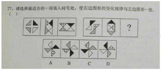 【解析】 考位置規(guī)律。圖形的組成元素相同看位置。本題是兩段式的考察方式,第一段找規(guī)律,第二段參考第一段用規(guī)律。第一段的規(guī)律告訴我們帶花紋的三角形,黑色三角形,陰影三角形,空白三角形先逆時(shí)針原地旋轉(zhuǎn)45度,再順時(shí)針原地旋轉(zhuǎn)45度得到第三幅圖。第二段遵循第一段規(guī)律得到D選項(xiàng)。或者做整體觀察所有的三角形,在重新組合的圖形中位置不變,在上方的始終在上方,在下方的始終在下方,在左側(cè)的始終在左側(cè),在右側(cè)的始終在右側(cè)。