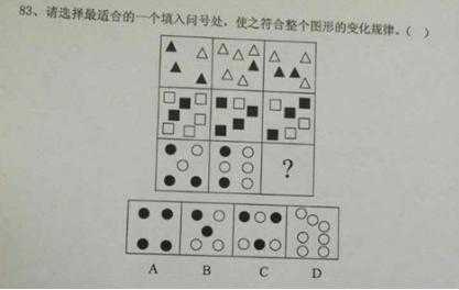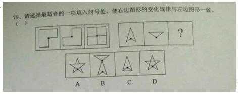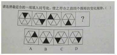 【解析】 圖形的組成元素相同看位置。本題是一條式的考察方式,黑色三角形在外圈旋轉(zhuǎn),順時(shí)針走的步數(shù)為1、2、3、等差數(shù)列,接下來(lái)第四幅圖要順時(shí)針走4步得到最后一個(gè)選項(xiàng)D。