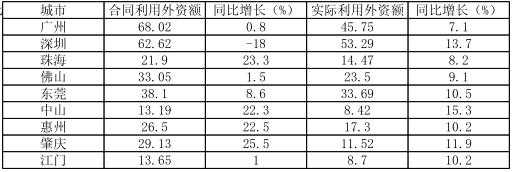 表 2012年珠三角九市利用外資情況