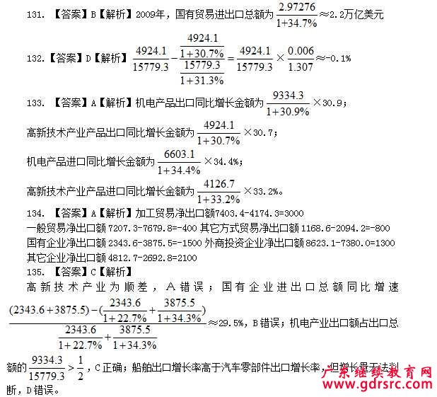 130.【答案】D 【解析】A選項,2008年底全國高速公路里程約為4.09+0.43+0.86+0.64=6.02(萬公里),則2008年的高速公路增長量0.48萬公里明顯不到2008年底的10%,A錯誤。B選項,河南作為內陸省份高于其他沿海省份的高速公路里程,B錯誤。C選項,2010年底國道占全國高速公路里程的比例為5.77,C錯誤。D選項,2010年國家高速公路新增里程占全國高速公路新增里程的比重為0.54,D正確。