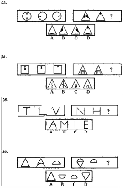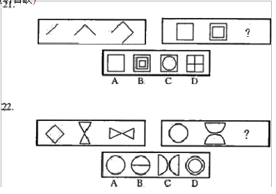 下面的每道題包含兩套圖形。這兩套圖形具有某種相似性,也存在某種差異。 其中第一套圖形包括 3 個圖形,第二套圖形包括兩個圖形和一個問號。認真觀察兩套圖形, 然后從 4 個供選擇的圖形中選擇你認為最適合取代問號的一個,在答題卡上將相應選項的序 號涂黑。(共 10 題、資料暫缺)