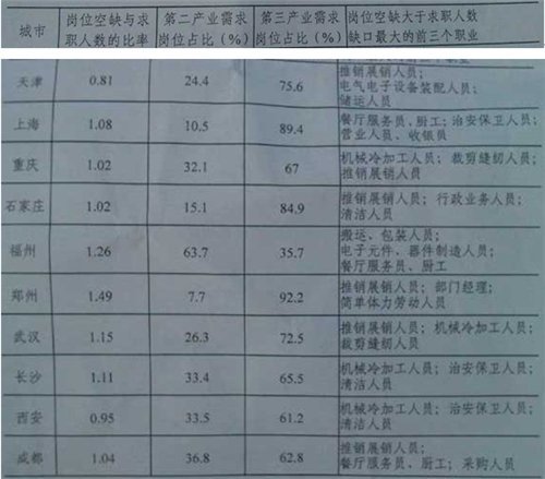 C.76萬 D.81萬 128.2012年第三季度全國十個城市中,第三產業需求崗位數超過第二產業2倍的城市共有: