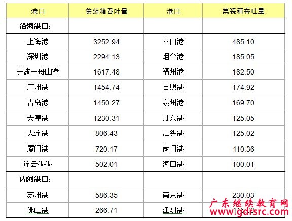 集裝箱吞吐量超過100萬TEU的港口由上年的19個增加到22個。其中,沿海港口18個,內河港口4個。