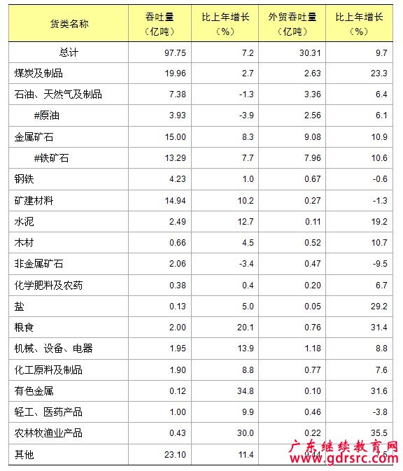 全國規模以上港口完成貨物吞吐量97.75億噸,比上年增長7.2%。其中,完成煤炭及制品吞吐量19.96億噸,石油、天然氣及制品吞吐量7.38億噸,金屬礦石吞吐量15.00億噸,分別增長2.7%、下降1.3%和增長8.3%。