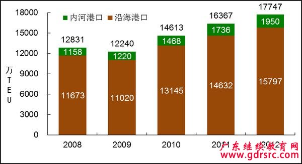 圖15 2008-2012年全國港口集裝箱吞吐量