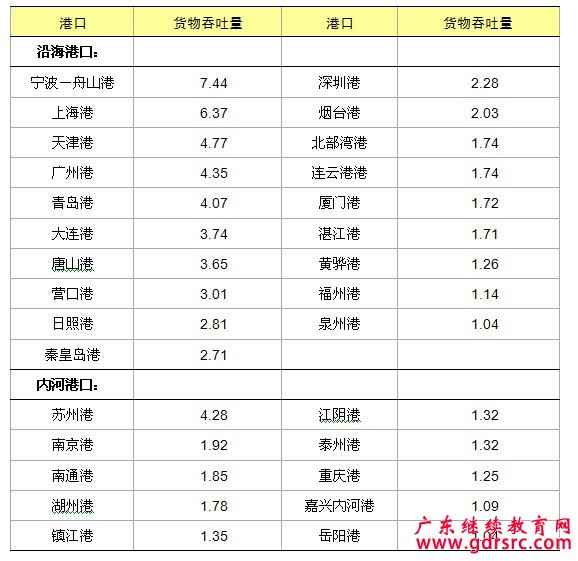 貨物吞吐量超過億噸的港口由上年的26個增加到29個。其中,沿海億噸港口19個,內河億噸港口10個。