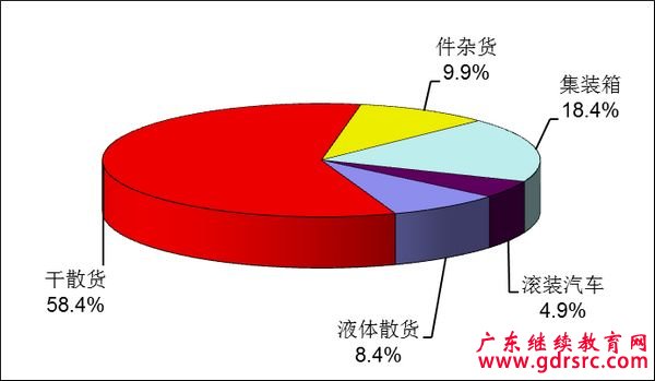 全國港口完成液體散貨吞吐量9.06億噸,比上年下降0.5%;干散貨吞吐量62.91億噸,增長7.4%;件雜貨吞吐量10.64億噸,增 長4.6%;集裝箱吞吐量(按重量計算)19.81億噸,增長11.7%;滾裝汽車吞吐量(按重量計算)5.33億噸,增長10.2%。液體散貨、干散 貨、件雜貨、集裝箱和滾裝汽車在港口貨物吞吐量中所占比重分別為8.4%、58.4%、9.9%、18.4%和4.9%。