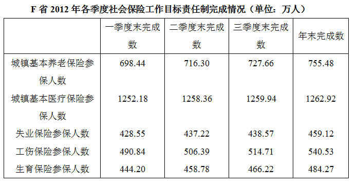 2012年,F(xiàn)省社會保險工作年度目標(biāo)任務(wù)如下:城鎮(zhèn)基本養(yǎng)老保險目標(biāo)任務(wù)為725.00萬人,城鎮(zhèn)基本醫(yī)療保險目錄任務(wù)為1260.00萬人,失業(yè)保險目標(biāo)任務(wù)為428.50萬人,工傷保險目標(biāo)為504.00萬人,生育保險目標(biāo)任務(wù)為453.00萬人。