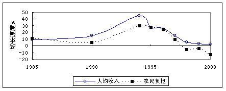 六、下圖是我國1985年-2000年農民人均收入和負擔增長速度比較圖。