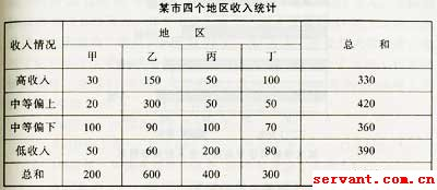 表中數據表明,高收入戶乙、丁地區多,但乙總戶數多,其比例沒有丁高,可簡單運算:
