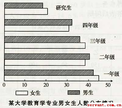 察的圖,但此圖有一個比較困難的地方是沒有具體的數據,只能根據圖示與參考圖下的標識來進行判斷,所以應試者的識圖能力應強。同時應試者應具備耐心、細心,認真去觀察、分析、比較,以選擇正確答案。根據題目的要求,容易觀察出研究生的女生數量少于其他年級。故本題的正確答案為D。