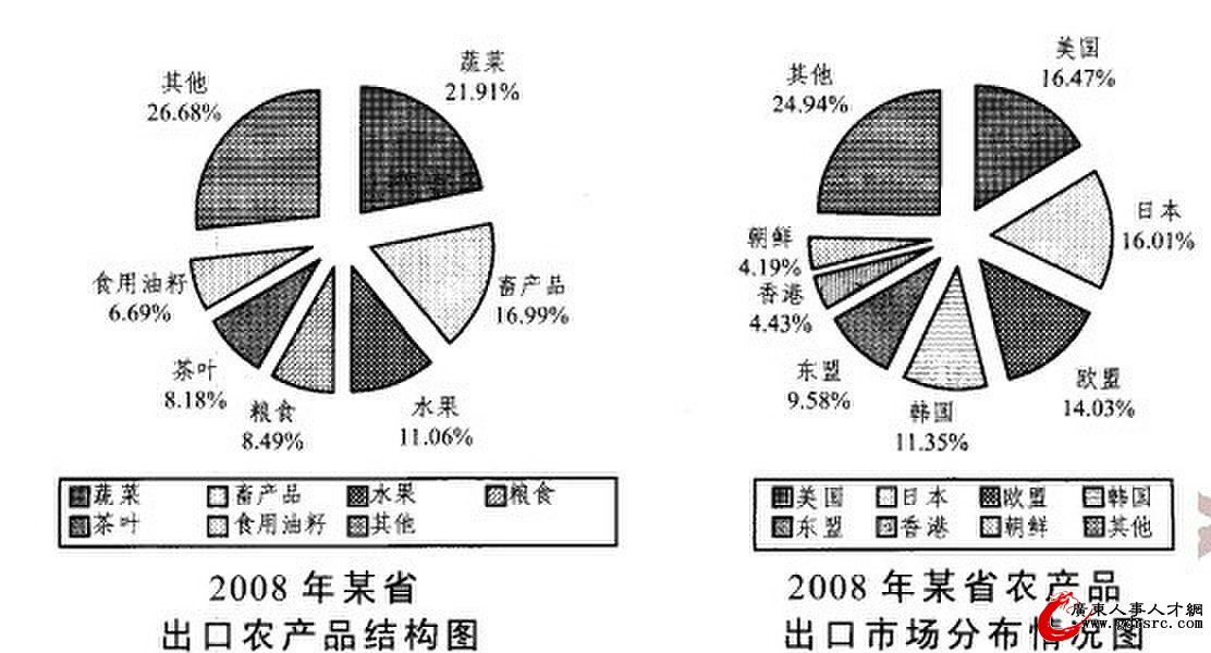 2008年,某省農產品進出口貿易總額為7.15億美元,比上年增長25.2%。其中。出口額為5.02億美元,增長22.1%;進口額為2.13億美元。增長33.2%。農產品進出口貿易額占全省對外貿易總額的4.5%。出口額居前5位的產品為蔬菜、畜產品、水果、糧食和茶葉。而綠茶出口額占茶葉出口額的四分之三。全省農產品對東歐、非洲、拉美等國家和地區的市場進一步開拓,出口額比上一年進一步增長。其中,對美國的出口額增長16.0%;對日本的出口額增長7.3%;對韓國的出口額增長59.8%;對東盟的出口額增58.6%