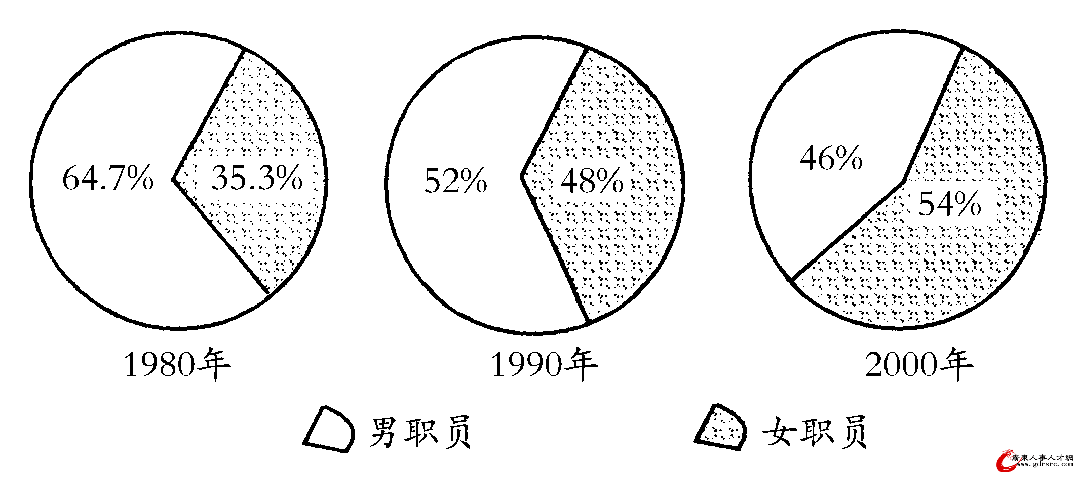 35.假如1990年和2000年職員總數相等,并且在此10年間女職員增長了60人,則男職員減少了:(   )