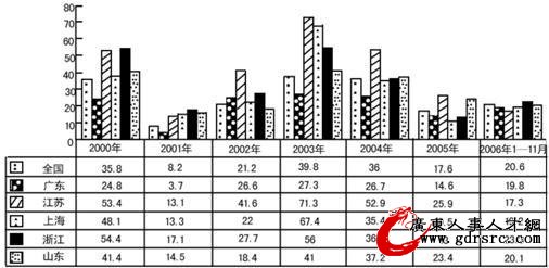 96.2000年以來,粵蘇滬浙魯五地進口增長率相差最小的時期是()。