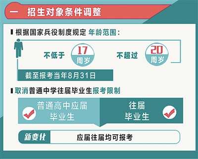 從今年起,根據國家兵役制度規定,報考軍事院校和國防生的考生最低報考年齡均不得低于17周歲、不超過20周歲(截至報考當年8月31日);取消普通高中往屆畢業生報考限制,符合條件的普通高中應屆、往屆畢業生均可報考。