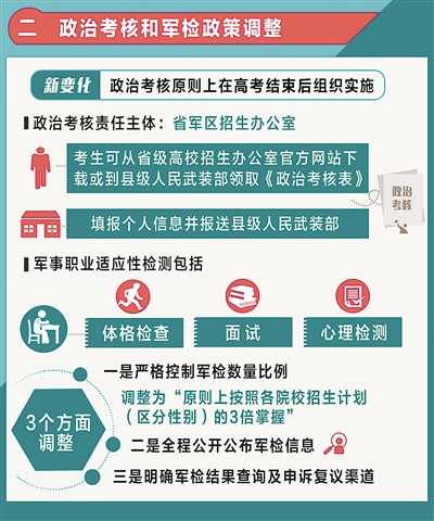 一是調整了政治考核的組織時間。為了增強政治考核的針對性、有效性,避免人力、物力浪費,政治考核主要在高考結束后組織實施,并由省軍區招 生辦公室在投檔錄取前將考生政治考核結論與軍事職業適應性檢測結論一并送交省級高校招生辦公室。二是簡化政治考核組織流程。明確省軍區招生辦公室為政治考 核的責任主體,負責確定政治考核組織程序和完成時限。考生可從省級高校招生辦公室官方網站下載或到縣級人民武裝部領取《政治考核表》,填報個人信息并報送 縣級人民武裝部。縣級人民武裝部扎實做好政治考核工作,并按時將政治考核合格考生名單、《政治考核表》集中報送省軍區招生辦公室。