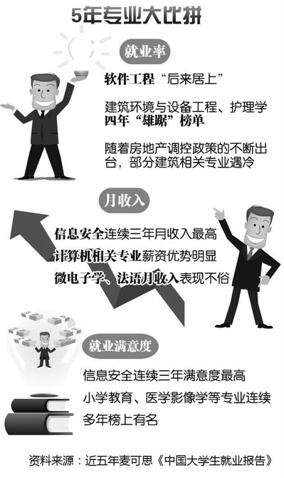 數(shù)據(jù)顯示,在2016屆本科畢業(yè)生就業(yè)率前五名里,信息類專業(yè)占三席,分別是軟件工程(96.5%)、電氣工程及其自動化(95.5%)以及信息管理與信息系統(tǒng)(95.4%)。