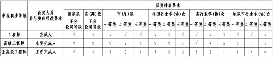 16.申報(bào)工程師、高級工程師、正高級工程師職稱的代表性成果清單中工程項(xiàng)目獎(jiǎng)項(xiàng)獲獎(jiǎng)項(xiàng)目的參與人員、排名要求如下表所示。(“√”表示符合參與項(xiàng)目程度要求的所有人,“×”表示此獎(jiǎng)項(xiàng)不能作為本申報(bào)類別的代表性成果,數(shù)字為代表性成果的獲獎(jiǎng)人員最末排名要求。)