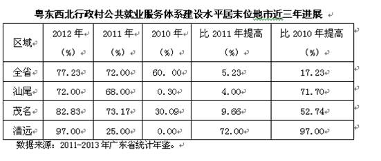 從行政村公共就業服務體系建設水平來看,2012年全省的行政村公共就業服務體系建設水平達到77.23%,比2011年提高5.23個百分點,比 2010年提高17.23個百分點。2010年行政村公共就業服務體系建設水平,粵東最低的地市是汕尾,為0.3%,2012年達到72%,提高了 71.7個百分點;粵西最低的地市是茂名,為30.09%, 2012年達到82.83%,提高了52.74個百分點;粵北最低的地市是清遠,為0,2012年達到97%(見下表)。