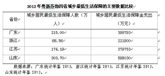 從投入存量來看,我省底線民生保障基礎薄弱。以城鄉居民最低生活保障(農村居民最低生活保障包含了農村五保)為例,2012年,廣東省城鄉居民最低 生活保障人數達到215萬人,城鄉居民最低生活保障金支出為399793萬元,低保人群年人均保障金為1859.50元/人。同期,若與廣東經濟社會發展 處于相當程度的江蘇、浙江和山東進行比較,可以看到廣東城鄉低保人數總量偏多,保障標準偏低,低保人群年人均保障金顯著低于浙蘇魯三省,與廣東“三個定 位、兩個率先”的總目標極不相稱,與廣東經濟社會發展水平極不匹配(見下表)。