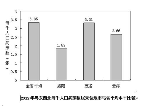 從每千人口病床數來看,2012年全省每千人口病床數達到3.35張,而同期粵東地區最低的揭陽市為1.82張,粵西地區最低的茂名市為3.31張,粵北地區最低的云浮2.66張,均明顯低于全省平均水平(見下圖)。
