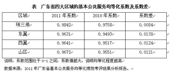 二是均等化程度較低。基本公共服務是指保護個人最基本的生存權和發展權所必需提供 的公共服務,其規定的是一定階段公共服務應該覆蓋的最小范圍和邊界。因此,在基本公共服務領域應盡可能地使使地區間、城鄉間和個體間享有大致相同的基本公 共服務,得到平等對待。但因受區域經濟發展不平衡的制約,粵東西北地區的均等化程度普遍較低。以廣東省基本公共服務均等化績效考核指標來看,珠三角和粵東 西北地區的基本公共服務均等化程度仍存較大差距(見下表)。