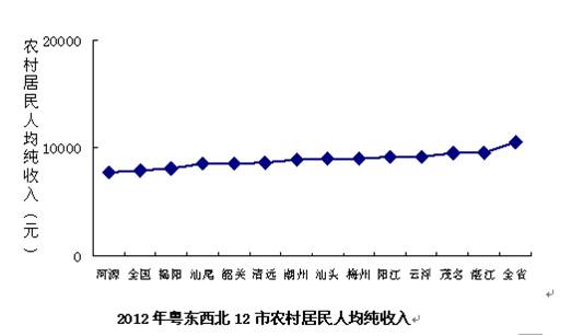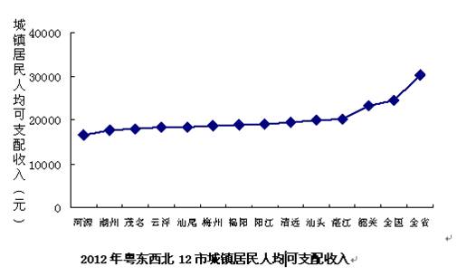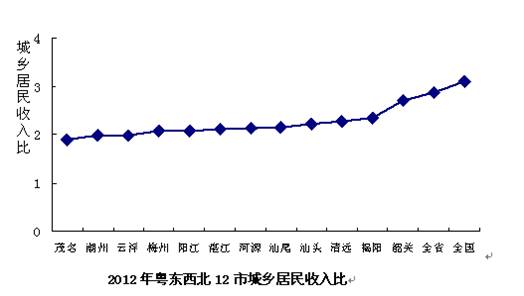 在城鎮居民人均可支配收入中,河源市最低,僅為16520元,只有全省平均水平的54.6%,也是粵東西北地區最高值韶關市的71.2%,地市之間 的差距明顯。在農村居民人均純收入中,河源市也最低,僅為7772元,是粵東西北地區最高值湛江市的81.2%,地市之間的差距明顯。從城鄉之間來看,粵 東西北地區的城鄉居民收入比在2上下波動,低于全省平均水平,也明顯低于全國平均水平。