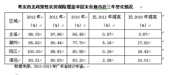 從政策性農房保險覆蓋率來看,2012年全省的政策性農房保險覆蓋率達到98.33%,比2011年提高0.47個百分點,比2010年提高 3.87個百分點。2010年政策性農房保險覆蓋率,粵東最低的地市是潮州,為77.7%,2012年達到95.62%,提高了17.92個百分點;粵西 最低的地市是陽江,為80.58%, 2012年達到100%,提高了19.42個百分點;粵北最低的地市是清遠,為83.2%,2012年達到93.21%,提高了10.01個百分點。(見 下表)