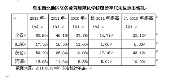 從義務教育規范化學校覆蓋率來看,2012年全省義務教育規范化學校覆蓋率達到60.9%,比2011年提高14.77個百分點,比2010年提高 23.12個百分點。2010年義務教育規范化學校覆蓋率,粵東最低的地市是汕尾,為11%,2012年達到17.36%,提高了6.36個百分點;粵西 最低的地市是茂名,為10.08%, 2012年達到53.2%,提高了43.12個百分點;粵北最低的地市是河源,為5.88%, 2012年達到16.08%,提高了10.2個百分點。(見下表)