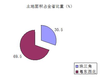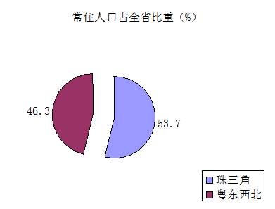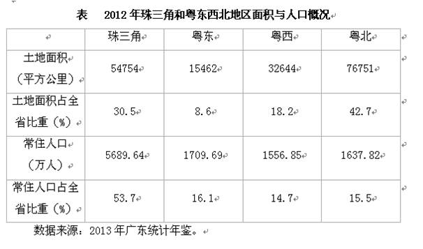 2012年,粵東地區區域總面積15462平方公里,占全省的8.6%;常住人口1709.69萬人,占全省的16.1%。粵西地區區域總面積 32644平方公里,占全省的18.2%;常住人口1556.85萬人,占全省的14.7%。粵北地區區域總面積76751平方公里,占全省的 42.7%;常住人口1637.82萬人,占全省的15.5%。