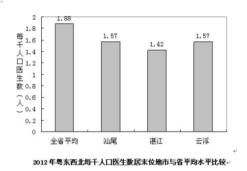 從每千人口醫生數來看,2012年全省每千人口醫生數達到1.88人,而同期粵東地區最低的汕尾市為1.57人,粵西地區最低的湛江市為1.42人,粵北地區最低的云浮1.57人,均明顯低于全省平均水平(見下圖)。
